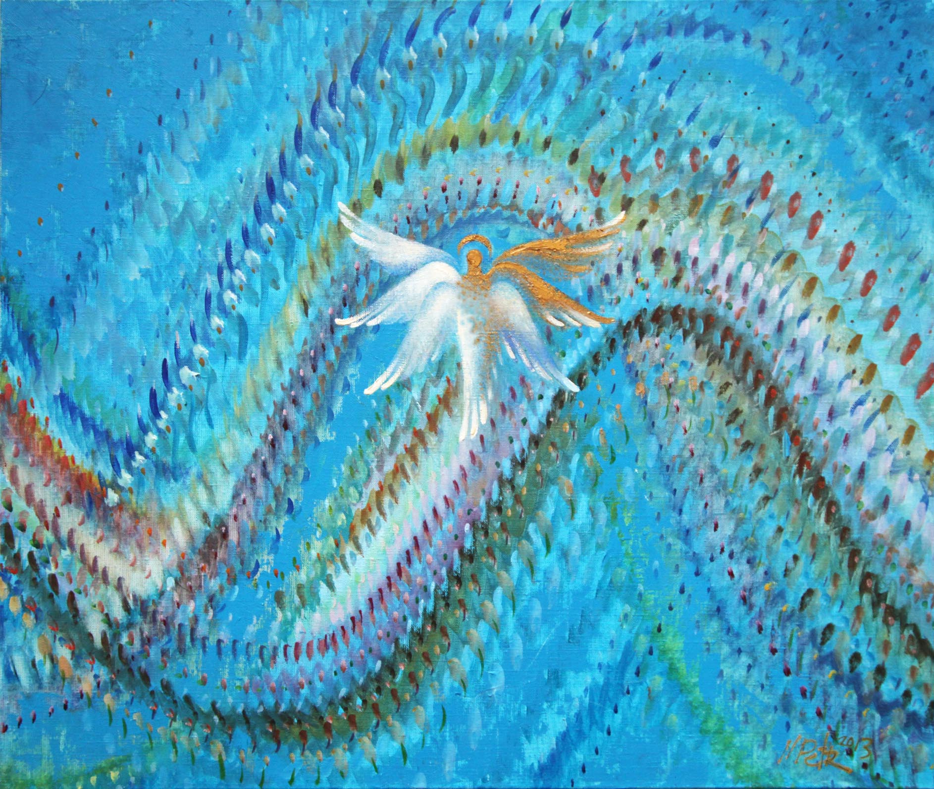 Ангел в лазурных тонах приносит нам добрые вести. Эта картина входит в серию “Music of Color”. Она была представлена на персональной выставке в Вене, Австрия “Universum” в 2019 году.